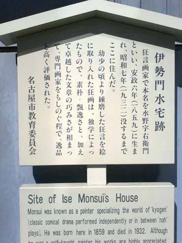 旦那衆・末広町の粋男、伊勢門水翁を紹介しなくてはなりません。末広町2丁目28番伊勢屋薬局水野の前には名古屋市教育委員会の門水宅跡の史跡看板があり、往時を偲ぶことができます。(写真1)