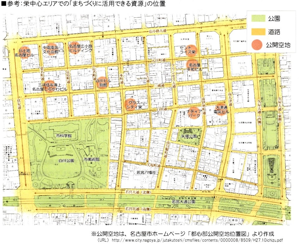 栄中心エリアでの「まちづくりに活用できる資源」の位置